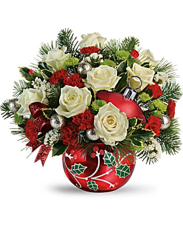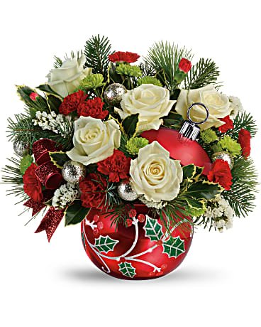 This beautiful in festive red, ceramic holly adorned ornament jar is an exclusive keepsake from Teleflora's Flowers-in-a-Gift collection. Add charm to the holiday with this gorgeous collectible!