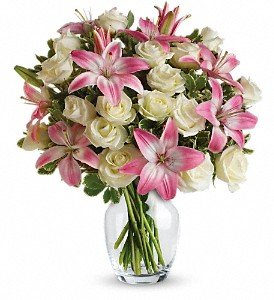 Elegant white roses and sweet pink asiatic lilies are hand-arranged with greens. It's the perfect way to show you love her always and forever.Approximately 15 1/2" W x 18" H