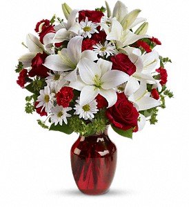 Red roses and carnations are exquisitely arranged with white asiatic lilies and chrysanthemums in a ruby red glass vase. It's lovely.Approximately 15" W x 18" H