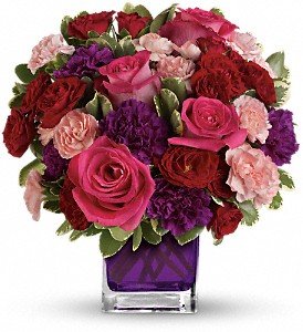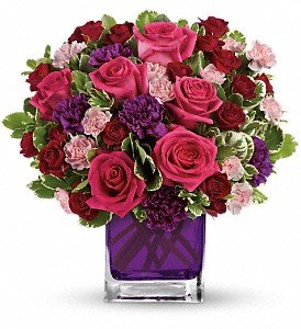 Hot pink roses, dark red spray roses, purple carnations and pink miniature carnations are accented with assorted greens. Delivered in Teleflora's glass violet cube.Approximately 11 1/2" W x 11 1/2" H