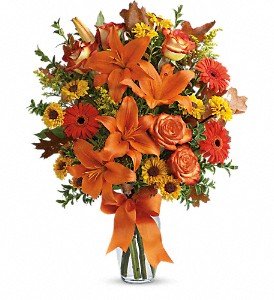 A mix of fresh flowers such as Asiatic lilies, Viking spray chrysanthemums, roses and a miniature gerbera - in shades of orange and yellow - is arranged with preserved oak leaves in a clear glass vase adorned with an orange satin ribbon.Approximately 8" W x 19" H
