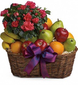 A big wicker basket comes overflowing with apples, bananas, pears and oranges that surround a hot pink azalea plant. This basket is ripe for giving!Approximately 16" W x 13 1/2" H