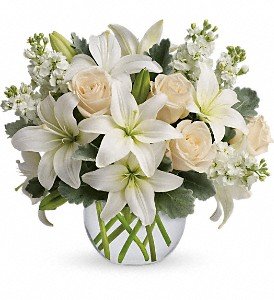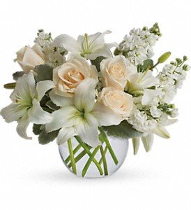 Crème roses, white asiatic lilies and stock stem are incredibly arranged in a bubble vase. When it comes to bouquets, this is definitely the right way to do white.Approximately 14" W x 11 1/2" H
