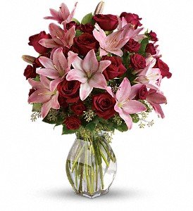 Radiant red roses and spray roses along with pretty in pink asiatic lilies are beautifully arranged in a stylish glass vase. It's a beautiful way to celebrate a romance that deepens with each passing year.Approximately 17" W x 20" H