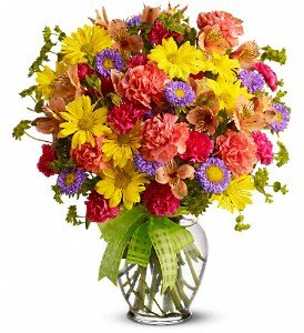 A summery mix of yellow daisy chrysanthemums, purple asters and hot pink and orange carnations - arranged in a clear ginger vase and adorned with a cheerful yellow plaid bow - will make their wishes come true!