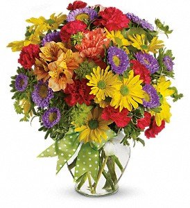 Yellow daisy spray chrysanthemums, purple Matsumoto asters, red miniature carnations, orange carnations and alstroemeria - accented with bupleurum - are delivered in a miniature ginger vase adorned with a plaid green ribbon.Approximately 10 1/2" W x 12 1/4" H