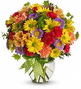A summery mix of yellow daisy chrysanthemums, purple asters and red and orange carnations - arranged in a clear ginger vase and adorned with a cheerful green plaid bow - will make their wishes come true!