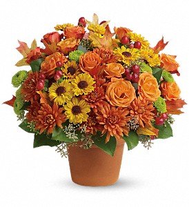 Chrysanthemums in autumnal colors of yellow, bronze and green - set off by fiery orange roses, seeded eucalyptus and hypericum - nestle together with brilliant fall leaves to create a bright floral arrangement that's reminiscent of a walk in the woods at sugar maple time. A terra-cotta pot adds a rustic touch.