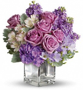 Lovely lavender hydrangea, roses, alstroemeria, stock and freesia arrive in a magical Mirrored Silver Cube. As sweet as a sugar cube!Approximately 12 1/2" W x 11 1/2" H