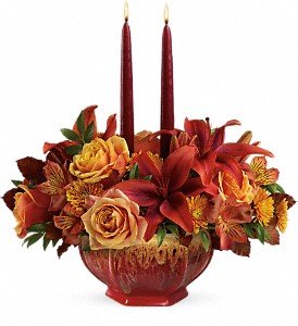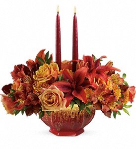 This centerpiece features orange bi-color roses, rust-colored asiatic lilies, dark orange alstroemeria, bronze cushion spray chrysanthemums, huckleberry, brown copper beech and two candles. Delivered in a Bounty Of Beauty bowl. Approximately 12 1/4" W x 14 1/2" H