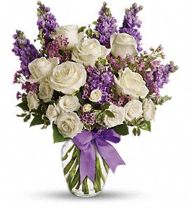 White roses and spray roses, lavender stock and waxflower, all perfectly arranged in a clear glass vase that's wrapped with purple ribbon.Approximately 14 1/2" W x 16 1/2" H