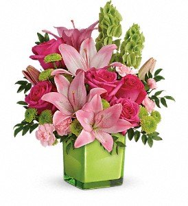 Lime-a-licious! Fresh shades of green are a great way to contrast pink roses and lilies. Hand-delivered in a lovely leaf green cube, it's a loving gift any day of the week!