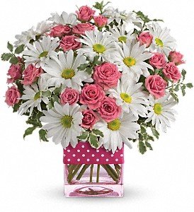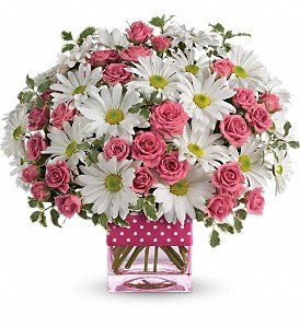 Pink spray roses and white daisy spray chrysanthemums are delivered in an exclusive pink vase that's wrapped with a polka-dot satin ribbon.Approximately 10" W x 9 1/2" H