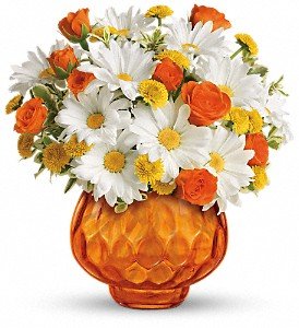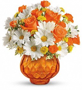 Happy as a country sunrise, this delightful bouquet features orange roses and white daisies in orange cut-glass votive bowl. When the flowers are gone, they can light a candle and have indoor sunshine forever. They'll adore it.