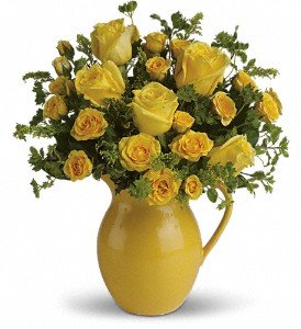 Brilliant yellow roses and spray roses are arranged in a delightful mix that's delivered in a keepsake yellow pitcher they can use again and again. What a heartwarming gift!Approximately 13 1/2" W x 14 1/2" H
