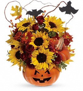 Red spray roses, bright yellow sunflowers, orange daisy spray chrysanthemums and curly willow make this bouquet so beautiful, it's scary! It's accented by two black bats and nestled inside our popular ceramic Trick & Treat Pumpkin, complete with a jack-o-lantern face. Happy Halloween!
